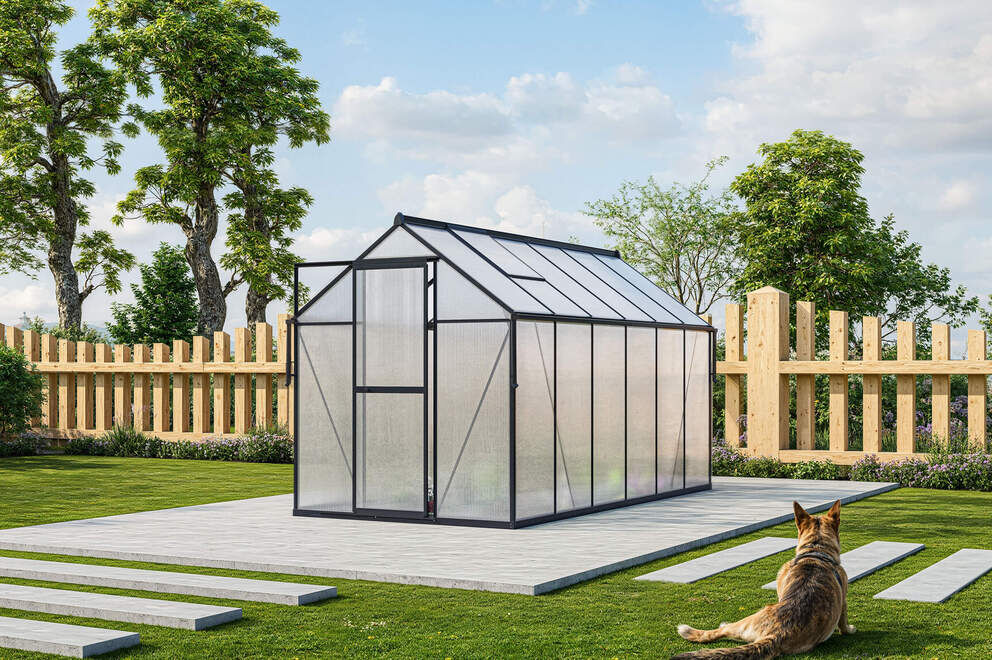 Die Wände und das Dach bestehen aus hochwertigen 6 mm starken Polycarbonatplatten, die hervorragende Isolationswerte und eine optimale Lichtdurchlässigkeit von ca. 75 % bieten. Diese UV-beständigen Hohlkammerplatten schützen Ihre Pflanzen zuverlässig vor intensiver Sonneneinstrahlung und Witterungseinflüssen, während sie gleichzeitig ein angenehmes, diffuses Licht für ein gleichmäßiges Wachstum erzeugen. So profitieren Ihre Pflanzen von einem optimalen Mikroklima – egal zu welcher Jahreszeit.