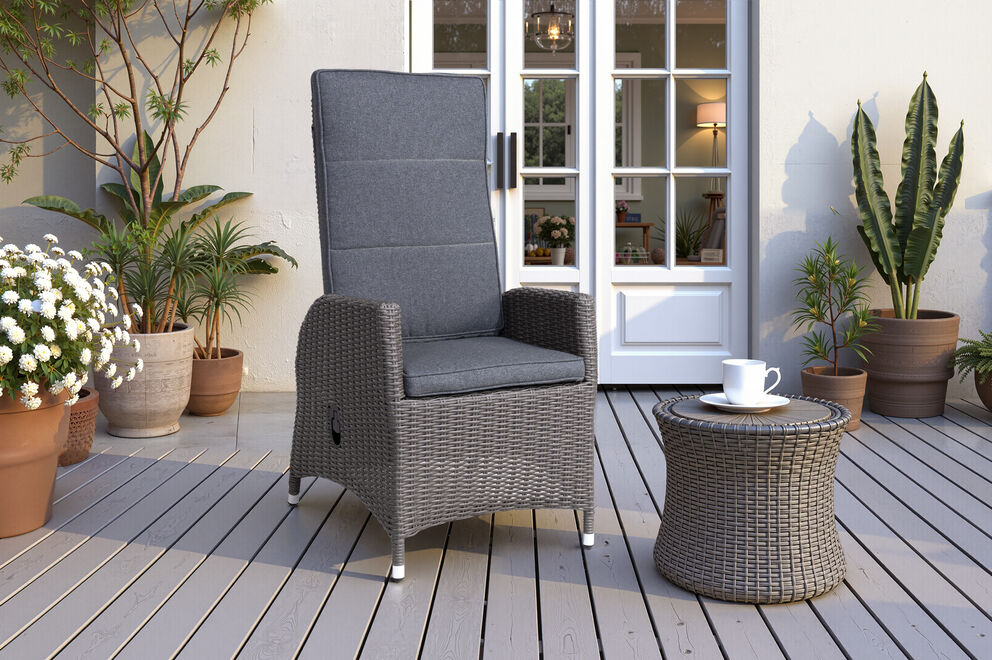 Dieser gemütliche Dining-Sessel ist wahrlich ein Verwandlungskünstler. Hier können Sie gemütlich mit einem guten Buch in der Sonne entspannen oder aber auch ganz bequem Ihr Mittag- oder Abendessen zu sich nehmen. Hierzu brauchen Sie einfach nur Platz zu nehmen und sich Ihren Lieblingssessel problemlos in eine bequeme Sitzposition einstellen. Dies gelingt kinderleicht dank der integrierten Gasdruckfeder - die Rückenlehne kann mit einem kleinen Hebel an der Seite stufenlos verstellt werden. Der Sessel hat ein Gesamtmaß von ca. 60 x 68 x 111 cm und bei einer Belastbarkeit von ca. 110 kg ist er sehr robust. Die Sitzfläche ist ca. 50 cm tief, die Sitzhöhe mit Kissen liegt bei ca. 49 cm. Die Armlehnen mit einer Höhe von ca. 67 cm sorgen bei diesem Sessel für besonderen Komfort.