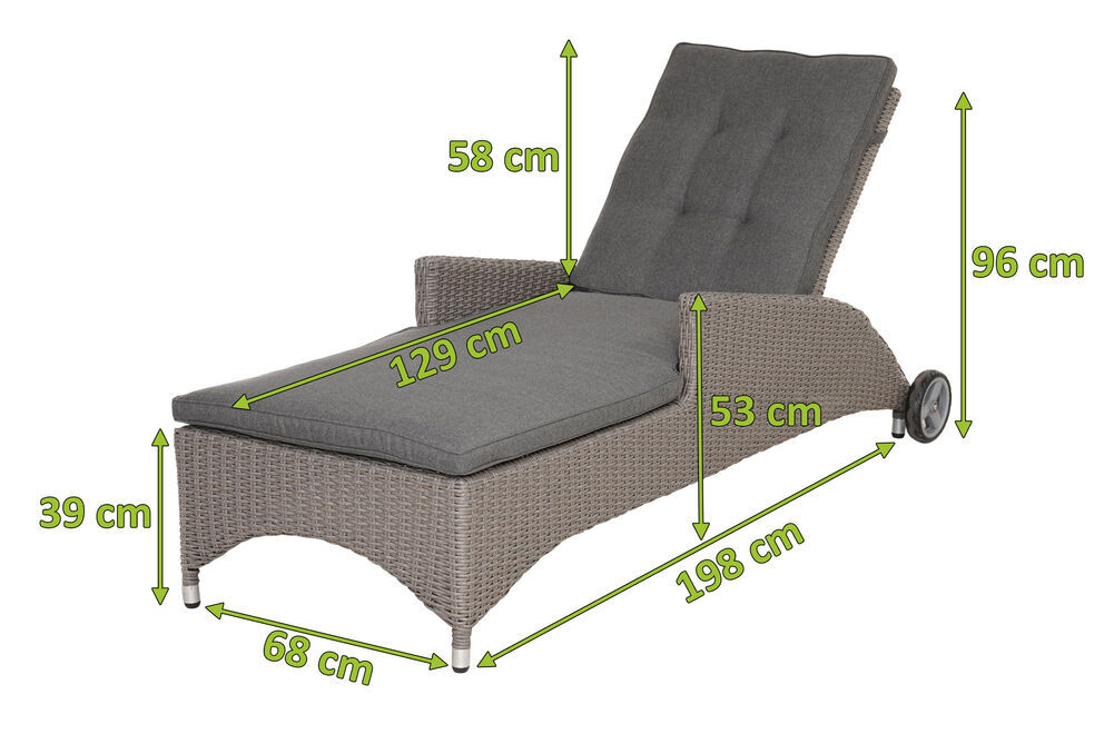 Auf dieser gemütlichen Rollliege können Sie mit einem guten Buch in der Sonne liegen und nach einem langen Arbeitstag entspannen. Hierzu brauchen Sie einfach nur Platz zu nehmen und sich problemlos eine bequeme Liege- oder Sitzposition einstellen. Dies gelingt kinderleicht dank der integrierten Gasdruckfeder - die Rückenlehne kann mit einem kleinen Hebel an der Seite stufenlos verstellt werden. Die Liege hat ein Gesamtmaß von ca. 198 x 68 x 96 cm. Die Sitzfläche ist ca. 129 cm lang, die Sitzhöhe beträgt ca. 43cm inkl. Kissen - so kommt die Entspannung beim Hinlegen von ganz allein. Die Armlehnen mit einer Höhe von ca. 53 cm sorgen bei dieser Liege für besonderen Komfort. Das Untergestell des Möbelstücks besteht aus Aluminium, dies macht es nicht nur stabil, sondern sorgt auch dafür, dass es sich aufgrund des relativ geringen Gewichts ganz leicht hin und her stellen lässt. Dabei unterstützen natürlich auch die integrierten Rollen. Das Aluminiumgestell wird mit Polyrattangeflecht bespannt. Das doppel-halbrunde Geflecht ist in der Farbe stahlgrau-meliert gehalten und passt so wunderbar zu allen möglichen Terrasseneinrichtungen. Gemütliche Sitz- und Rückenpolster (100 % Polyester (220 g/m³)) mit einer Stärke von ca. 4 cm sorgen für höchsten Sitzkomfort. Farblich sind die anthrazitfarbenen Polster perfekt auf das Geflecht abgestimmt.