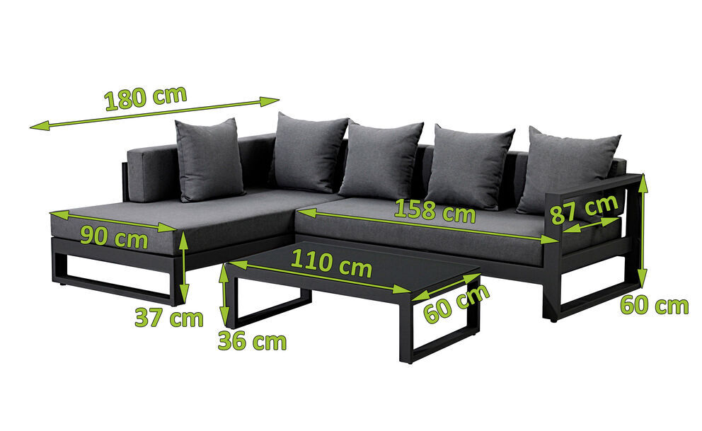 Das Set besteht insgesamt aus 3 Elementen. Zum einen aus einem 3-Sitzer Loungesofas, sowie aus einem Eckelement und einem Tisch. Der Tisch eignet sich ideal als Ablage für Getränke oder Ihre technischen Begleiter, wie z.B. Tablet oder Laptop. Das 3-Sitzer-Sofa hat die Gesamtmaße von ca. 158 x 90 x 60 cm. Das Eckelement hat die Maße von ca. 180 x 90 x 60 cm. Dank der luxuriösen Größe der gesamten Lounge finden Sie genug Platz für bis zu 5 Personen und haben auch genug Platz, um sich mal hinzulegen für ein Nickerchen. Das Gestell der Sitzgruppe besteht aus pulverbeschichtetem Aluminium in dunkelgrau und die Sitz- und Rückenfläche verfügt über Polster aus 100% Polyester. Der passende moderne Tisch darf auch nicht fehlen. Mit einer Größe von ca. 110 x 60 x 36 cm bietet er genügend Platz, um auch mal einen Snack oder Getränkeauswahl zu servieren. Die Tischplatte aus Sicherheitsglas in Kombination mit den anthraziten Farben verleiht dieser Lounge einen eleganten Look. Sicherheitsglas ist pflegeleicht und splittert nicht, sollte es einmal kaputtgehen. Die Bezüge der Polster sind pflegeleicht und abnehmbar, sodass Verschmutzungen keinerlei Probleme mehr darstellen. Entnehmen Sie den Bezug durch das Öffnen des Reißverschlusses und reinigen Sie diesen normal in Ihrer Waschmaschine. Für lange Freude am Komfort Ihrer Sitzpolster empfehlen wir, die Kissen bei Regen trocken zu lagern oder gleich die gesamte Lounge mit einer unserer praktischen Abdeckhauben abzudecken. Diese finden Sie im Reiter Zubehör auf der Artikelseite. Die hohe Qualität der Materialien sorgt für eine lange Lebensdauer und hohe Funktionalität, wodurch Sie viel Freude an diesem Set haben werden.