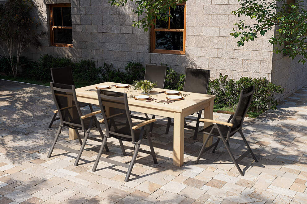 Die Materialien der Zadar Garten-Essgruppe wurden gezielt auf Langlebigkeit und Outdoor-Tauglichkeit ausgelegt: Recyceltes Teakholz für den nachhaltigen Aspekt, rostfreies und korrosionsbeständiges Aluminium für die Stabilität sowie modernes Textilene für optimalen Sitzkomfort – diese Kombination macht das Set zum idealen Begleiter für sonnige Jahreszeiten.