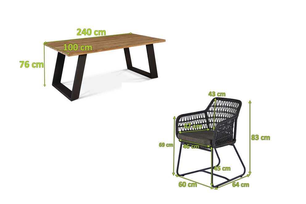 Ausgefallen, edel und robust zugleich präsentiert sich diese Design-Sitzgruppe aus dem Hause OUTFLEXX®. Das Set besteht aus einem schönen Esstisch mit den Maßen von ca. 240 x 100 x 76 cm und 6 bequemen Sesseln mit den Maßen von ca. 60 x 64 x 83 cm mit einer Sitzhöhe von ca. 45 cm und einer Sitztiefe von ca. 47 cm.