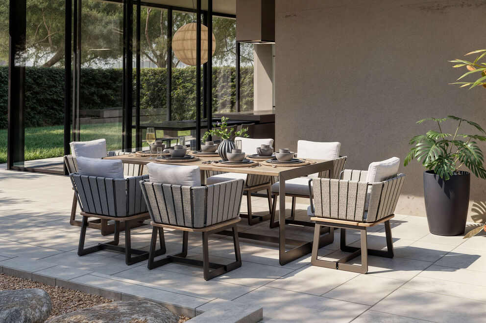Die PLOSS Aurora Garten-Essgruppe überzeugt durch ihre klare Formensprache und die kontrastreiche Kombination aus dunklem Aluminiumgestell, Holzoptik und hellen Polstern. So schaffen Sie ein zeitloses Ambiente, das Eleganz und Komfort vereint und sich perfekt in moderne Garten- und Terrassenstile einfügt. |