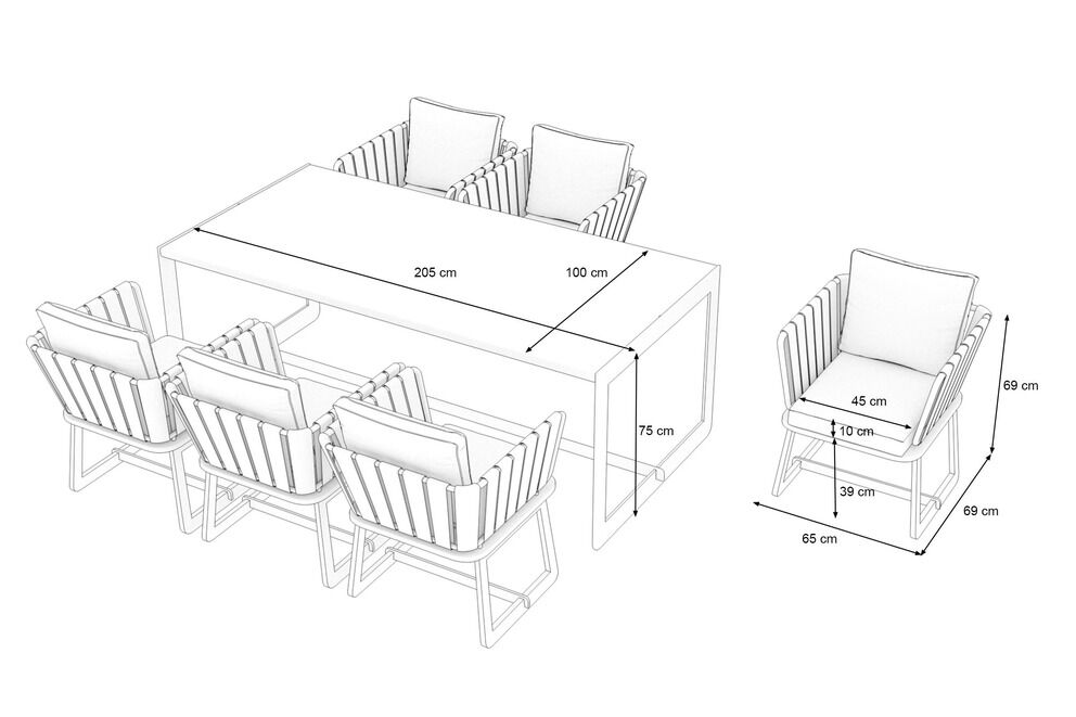 Das Ensemble besteht aus einem großzügigen Esstisch und sechs komfortablen Sesseln. Der Tisch beeindruckt mit klaren Linien und einem pulverbeschichteten Aluminiumgestell in Anthrazit, das für Stabilität und Langlebigkeit sorgt. Die Tischplatte ist mit ca. 8 mm starkem Sicherheitsglas in Holzoptik versehen und verbindet natürliche Wärme mit pflegeleichter Funktionalität. Mit einer Größe von ca. 202 x 100 x 77 cm bietet der Tisch reichlich Platz für Speisen, Getränke und Dekoration.