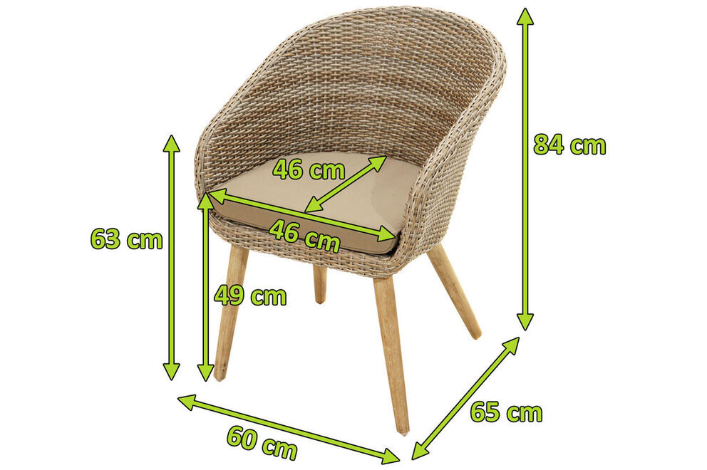 Das Untergestell der Sitzschale besteht aus pulverbeschichtetem Aluminium, wodurch das Gestell witterungs- und korrosionsbeständig ist - so werden Sie lange Freude an diesem Sessel haben. Das Aluminiumgestell wird mit Polyrattangeflecht bespannt. Das halbrunde Geflecht ist in der Farbe beige-meliert gehalten und schafft so helle und freundliche Momente in alle Terrasseneinrichtungen. Das gemütliche Sitzkissen (100 % Polyester) sorgt für höchsten Sitzkomfort. Farblich ist das taupefarbene Polster perfekt auf das Geflecht abgestimmt.