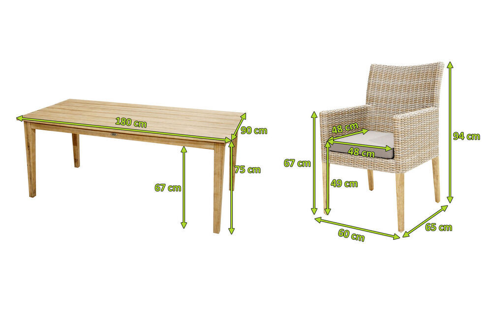 Der Esstisch sowie die Stuhlbeine bestehen aus 100% FSC-Akazienholz. Durch die FSC Zertifizierung wird sicher gestellt, dass das Holz aus verantwortungsbewussten Quellen stammt. Akazienholz zeichnet sich vor allem durch seine Widerstandsfähigkeit und Härte sowie seine elegante Maserung aus. Das Untergestell der Sitzschale besteht aus pulverbeschichtetem Aluminium, wodurch das Gestell witterungs- und korrosionsbeständig ist - so werden Sie lange Freude an diesen Sesseln haben. Das Aluminiumgestell wird mit einem halbrunden Geflecht bespannt und ist in der Farbe beige-meliert gehalten. Das gemütliche Sitzkissen (100 % Polyester) in der Farbe taupe sorgt für höchsten Sitzkomfort und rundet die Optik dieser Esstischgruppe ab.