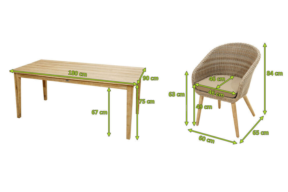 Die handlichen Sessel haben ein Gesamtmaß von jeweils ca. 60 x 65 x 84 cm und bei einer Belastbarkeit von ca. 110 kg ist er sehr robust. Mit seinem geringen Gewicht von ca. 6 kg ist der Sessel zudem schnell und einfach umzustellen. Die Sitzfläche ist ca. 46 cm tief, die Sitzhöhe mit Kissen liegt bei ca. 49 cm. Der enthaltene Esstisch bietet mit Maßen von ca. 180 x 90 x 75 cm eine ausladende Abstellfläche - genügend Platz für Kaffee und Kuchen, oder aber auch für Snacks und Getränke. Dazu weist der Tisch eine Unterschubhöhe von ca. 67 cm vor. Die Diningsessel können mit einer Armlehnenhöhe von ca. 63 cm problemlos unter den Tisch geschoben werden.