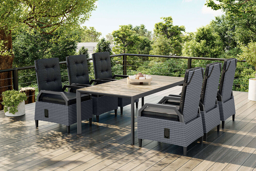 Die sechs zugehörigen Dining-Sessel aus hochwertigem Polyrattan überzeugen durch ihren Komfort und ihre Strapazierfähigkeit. Sie sind witterungsbeständig und mit UV-beständigen Sitz- und Rückenkissen ausgestattet, die auch nach längerer Nutzung ihre Form und Farbe behalten. Mit einer ergonomischen Rückenlehne und einer Sitzbreite von ca. 60 cm bieten die Sessel ein angenehmes Sitzgefühl. Jeder Sessel wiegt ca. 10,2 kg, was sie stabil und dennoch leicht genug macht, um sie flexibel zu positionieren.
