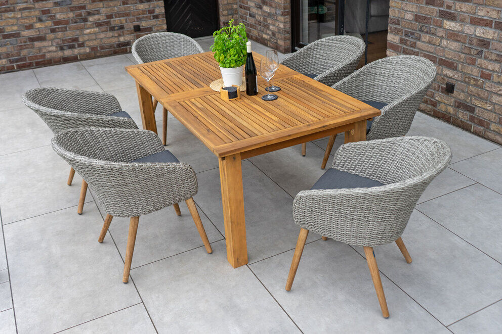 Erleben Sie stilvolle Momente im Freien mit der PLOß Kota Gartenessgruppe. Diese exquisite Kombination aus einem hochwertigen Esstisch und sechs komfortablen Sesseln schafft eine einladende Atmosphäre in Ihrem Garten oder auf Ihrer Terrasse. Die Farben grau und natur harmonieren perfekt miteinander und verleihen der Essgruppe einen zeitlosen und eleganten Look.