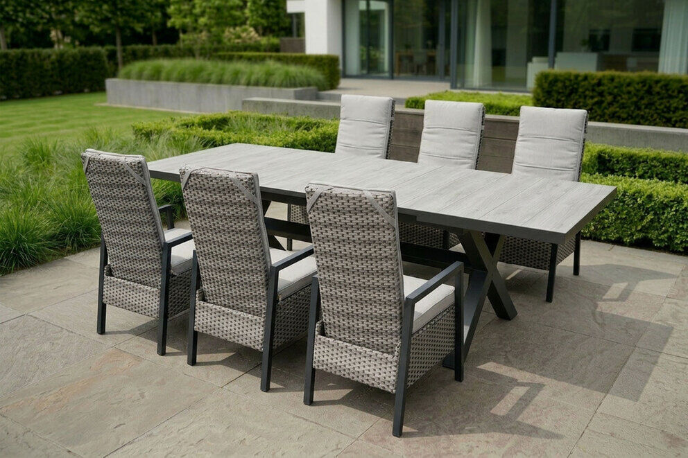 Diese gemütliche Esstischgruppe bietet bequem bis zu 6 Personen Platz. Das Set besteht aus einem Auszugs-Dining-Tisch und sechs Diningsesseln. Hier können Sie bequem Ihr Mittag- oder Abendessen zu sich nehmen - und danach mit einem guten Buch in der Sonne entspannen. Hierzu brauchen Sie einfach nur Platz zu nehmen und eine bequeme Sitzposition einstellen. Dies gelingt kinderleicht dank der integrierten Gasdruckfeder - die Rückenlehne kann mit einem kleinen Knopf an der Seite stufenlos verstellt werden.