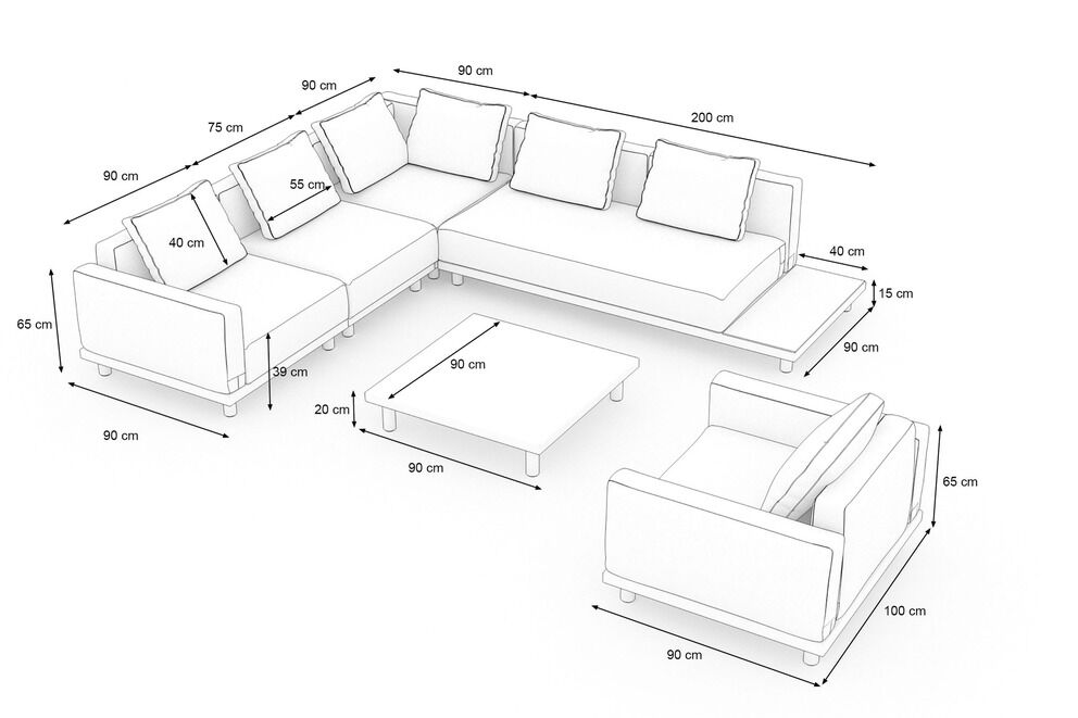 Die Maße der einzelnen Elemente sind großzügig bemessen und schaffen viel Raum für Komfort: Der Sessel misst ca. 90 x 90 x 65 cm, das Mittelsofa ca. 90 x 90 x 65 cm, das Ecksofa ca. 90 x 90 x 65 cm und der Zweisitzer mit Ablage ca. 200 x 90 x 65 cm. Der Loungetisch hat die Maße von ca. 90 x 90 x 20 cm und fügt sich perfekt in das Gesamtbild ein. Alle Elemente sind so konzipiert, dass sie sich harmonisch kombinieren lassen und viel Platz für entspannte Sitz- und Liegepositionen bieten.
