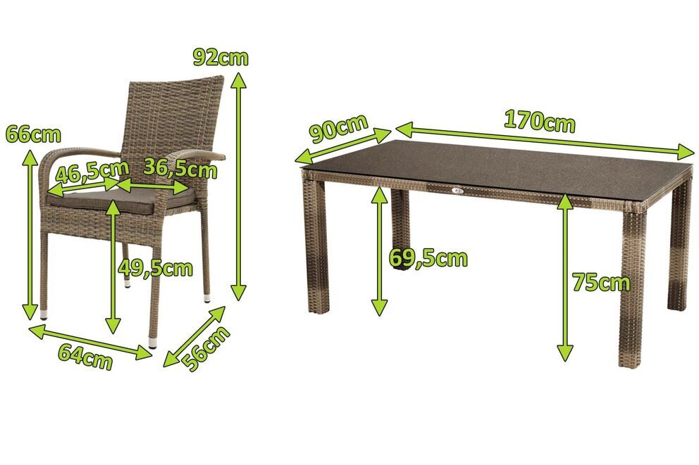 Dieses gemütliche Möbelset bietet bequem bis zu vier Personen Platz. Das Set besteht aus vier praktischen Stapelstühlen und einem Dining Tisch. Der gemütliche Stapelstuhl passt sich perfekt an Ihren Garten, die Terrasse oder den Balkon an. Der Sessel hat ein Gesamtmaß von ca. 56 x 64 x 92 cm. Die Sitzfläche ist ca. 46,5 cm tief, die Sitzhöhe mit Kissen liegt bei ca. 49,5 cm. Die Armlehnen mit einer Höhe von ca. 66 cm sorgen bei diesem Sessel für besonderen Komfort. Mit seinem Gewicht von ca. 5,5 kg lässt sich der Stuhl ganz leicht verschieben. Bei Nichtgebrauch können Sie mehrere Stühle ganz leicht aufeinanderstapeln und diese platzsparend verstauen. Der Tisch bietet dank seiner Maße von ca. 170 x 90 x 75 cm großzügig Platz für vier bis sechs Personen - so steht einem gemütlichen Mittagessen mit der Familie nichts im Wege. Er wird mit einer ca. 8 mm starken Spraystone Platte (Glasplatte in Steinoptik) geliefert. Daraus ergibt sich eine wetter- und stoßfeste sowie pflegeleichte Oberfläche in einer eleganten Natursteinoptik, die sich mit einem milden Reiniger und einem Lappen kinderleicht pflegen lässt. Die Tischbeine haben ein Maß von ca. 8 x 8 cm, während die Unterschubhöhe des Tisches ca. 69,5 cm beträgt.