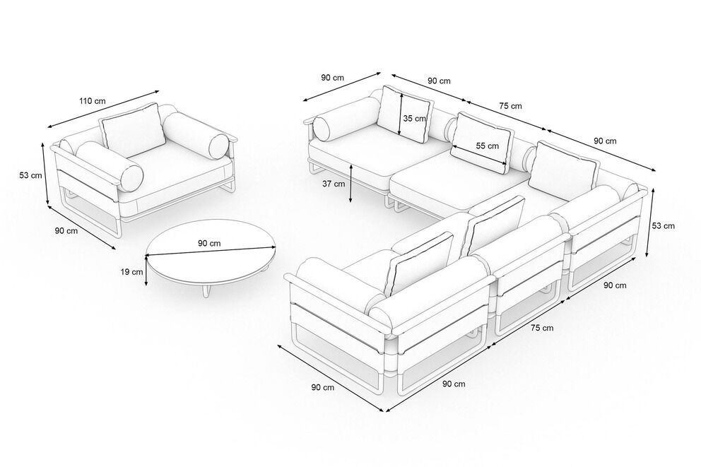 Das Set besteht aus einem großzügigen Lounge-Ensemble, das durch seine vielseitige Anordnung flexibel eingesetzt werden kann. Mit einem ca. 110 x 90 cm großen Sessel, zwei ca. 90 x 90 cm Mittelsofas, einem ca. 90 x 75 cm Abschlusssofa links, einem ca. 90 x 75 cm Abschlusssofa rechts, einem ca. 90 x 90 cm Ecksofa sowie einem runden Loungetisch mit einem Durchmesser von ca. 90 cm und einer Höhe von ca. 18 cm erhalten Sie ein Komplettpaket, das keine Wünsche offenlässt. Passend dazu sind alle Polster, elf zylinderförmige Kissen und sechs Dekokissen im Lieferumfang enthalten.