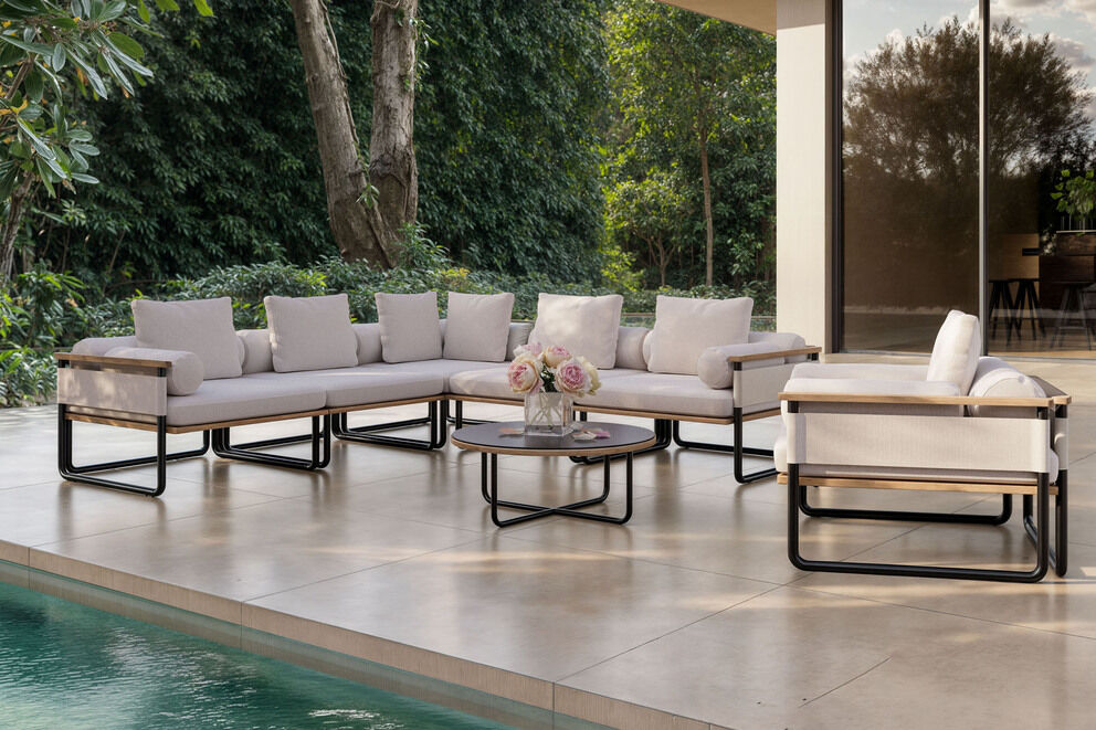 Die harmonische Kombination aus cremefarbenen Polstern, schwarzen Aluminiumgestellen und natürlichen Holzdekor-Akzenten verleiht Ihrem Außenbereich eine stilvolle und moderne Atmosphäre. |