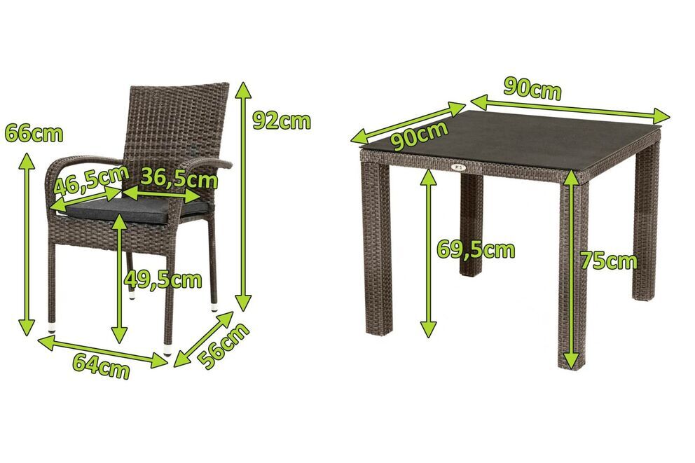 Dieses gemütliche Balkonset bietet bequem bis zu zwei Personen Platz. Das Set besteht aus zwei praktischen Stapelstühlen und einem Dining Tisch. Der gemütliche Stapelstuhl passt sich perfekt an Ihren Balkon an. Der Sessel hat ein Gesamtmaß von ca. 56 x 64 x 92 cm. Die Sitzfläche ist ca. 46,5 cm tief, die Sitzhöhe mit Kissen liegt bei ca. 49,5 cm. Die Armlehnen mit einer Höhe von ca. 66 cm sorgen bei diesem Sessel für besonderen Komfort. Mit seinem Gewicht von ca. 5,5 kg lässt sich der Stuhl ganz leicht verschieben. Bei Nichtgebrauch können Sie mehrere Stühle ganz leicht aufeinanderstapeln und diese platzsparend verstauen. Der Tisch bietet dank seiner Maße von ca. 90 x 90 x 75 cm großzügig Platz für zwei bis vier Personen. Er wird mit einer ca. 8 mm starken Spraystone Platte (Glasplatte in Steinoptik) geliefert. Daraus ergibt sich eine wetter- und stoßfeste sowie pflegeleichte Oberfläche in einer eleganten Natursteinoptik, die sich mit einem milden Reiniger und einem Lappen kinderleicht pflegen lässt. Die Tischbeine haben ein Maß von ca. 8 x 8 cm, während die Unterschubhöhe des Tisches ca. 69,5 cm beträgt.