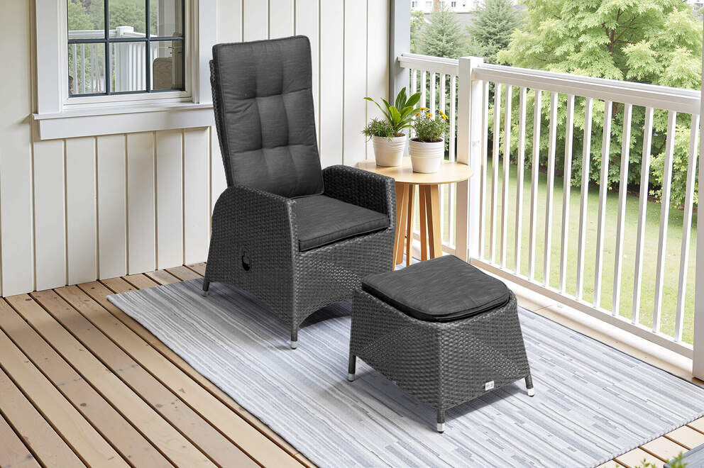 Dieser gemütliche Diningsessel ist wahrlich ein Verwandlungskünstler. Hier können Sie gemütlich mit einem guten Buch in der Sonne liegen oder aber auch ganz bequem Ihr Mittag- oder Abendessen zu sich nehmen. Hierzu brauchen Sie einfach nur Platz zu nehmen und sich Ihren Lieblingssessel problemlos in eine bequeme Liege- oder Sitzposition einstellen. Dies gelingt kinderleicht dank der integrierten Gasdruckfeder - die Rückenlehne kann mit einem kleinen Hebel an der Seite stufenlos verstellt werden. Der Sessel hat ein Gesamtmaß von ca. 60 x 68 x 111 cm. Die Sitzfläche ist ca. 47 cm tief, die Sitzhöhe mit Kissen liegt bei ca. 47,5 cm. Die Armlehnen mit einer Höhe von ca. 66 cm sorgen bei diesem Sessel für besonderen Komfort. Der gemütliche Hocker ist die perfekte Ergänzung zum Diningsessel Rocking. Hier können Sie gemütlich die Beine hochlegen und nach einem langen Arbeitstag entspannen - und wenn nötig haben Sie sogar direkt eine weitere Sitzgelegenheit für spontane Gäste. Der Hocker hat ein Gesamtmaß von ca. 56 x 54 x 41 cm.