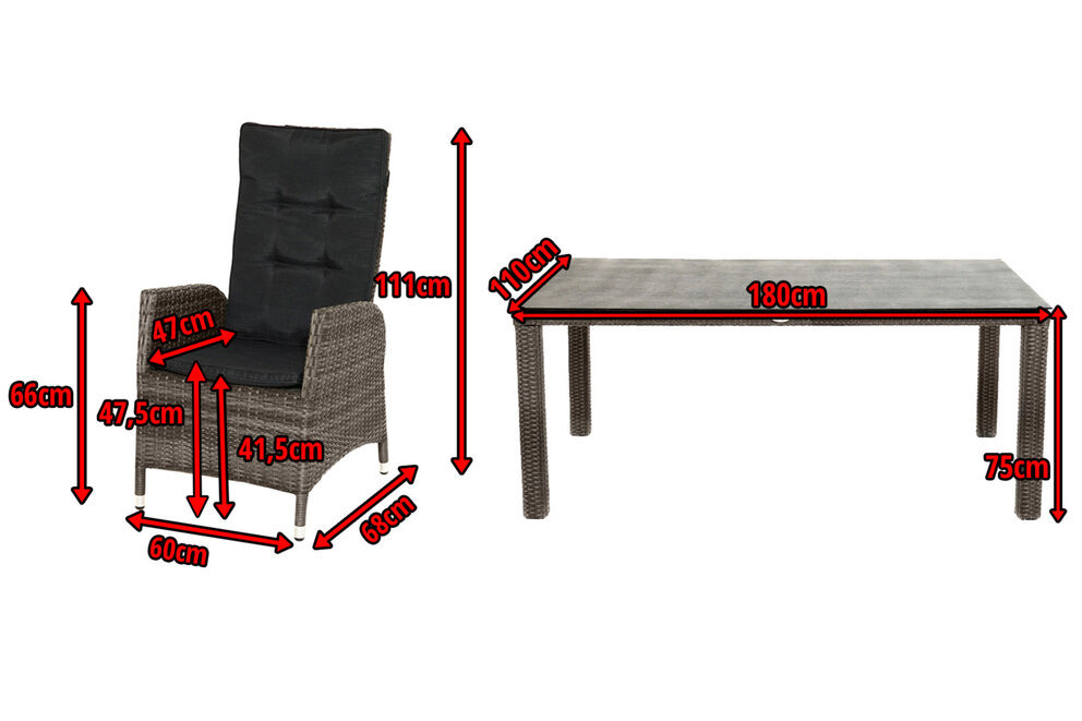 Dieses gemütliche Dining Set bietet bequem bis zu vier Personen Platz. Hier können Sie bequem Ihr Mittag- oder Abendessen zu sich nehmen - und danach mit einem guten Buch in der Sonne liegen. Hierzu brauchen Sie einfach nur Platz zu nehmen und sich Ihren Lieblingssessel problemlos in eine bequeme Liege- oder Sitzposition einstellen. Dies gelingt kinderleicht dank der integrierten Gasdruckfeder - die Rückenlehne kann mit einem kleinen Hebel an der Seite stufenlos verstellt werden. Der Sessel hat ein Gesamtmaß von ca. 60 x 68 x 111 cm. Die Sitzfläche ist ca. 47 cm tief, die Sitzhöhe mit Kissen liegt bei ca. 47,5 cm. Die Armlehnen mit einer Höhe von ca. 66 cm sorgen bei diesem Sessel für besonderen Komfort. Dieser praktische Diningtisch bietet dank seiner Maße von ca. 180 x 110 x 75 cm Platz für sechs bis acht Personen - so steht einem gemütlichen Mittagessen mit der Familie nichts im Wege. Er wird mit einer ca. 8 mm starken Glasplatte in Steinoptik geliefert.