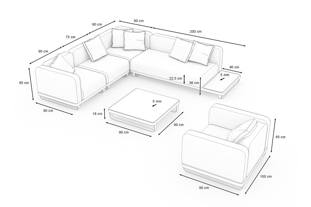 Das großzügige Set besteht aus einem Sessel, einem Mittelsofa, einem Abschlusssofa rechts, einem Zweisitzer mit integrierter Ablage, einem Ecksofa sowie einem modernen Loungetisch. Zusätzlich sind sieben dekorative Kissen und komfortable Sitz- und Rückenpolster im Lieferumfang enthalten. Die Kombination aus klarer Formsprache und weichen Polstern schafft ein harmonisches Gesamtbild, das sowohl zeitlos als auch modern wirkt.
