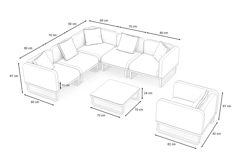 Die Maße sind auf Komfort und Funktionalität abgestimmt: Jedes Sofa-Element misst ca. 80 x 80 x 65 cm (B x T x H) bei einer Sitzhöhe von ca. 37 cm. Der Sessel ist ebenfalls ca. 80 x 80 x 65 cm groß und bietet großzügigen Platz für entspannte Stunden. Der Loungetisch ergänzt das Ensemble mit ca. 70 x 70 x 24 cm (B x T x H) und eignet sich ideal, um Getränke, Snacks oder Dekoration darauf abzustellen.