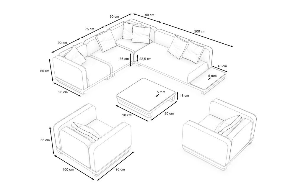 Mit ca. 200 x 90 x 64 cm beim Sofa mit Ablage, ca. 100 x 90 x 64 cm beim Sessel und ca. 90 x 90 x 20 cm beim Tisch überzeugt die Lounge durch viel Platz für Familie und Gäste. |