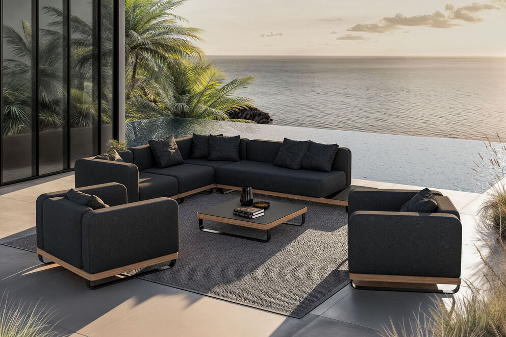 Das pulverbeschichtete Aluminiumgestell in Anthrazit ist nicht nur optisch ein Highlight, sondern garantiert zudem Stabilität, Korrosionsbeständigkeit und eine lange Lebensdauer. Abgerundet wird das Design durch elegante Holzdekor-Elemente, die der Lounge einen natürlichen und gleichzeitig modernen Charakter verleihen. Die Tischplatte aus ca. 5 mm starkem Sicherheitsglas in Schwarz wirkt edel und ist gleichzeitig pflegeleicht und robust.