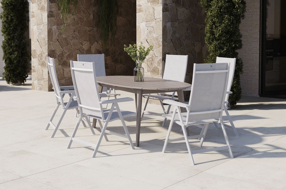 Passend zum Tisch umfasst das Set sechs KETTLER BASIC PLUS Multipositionssessel in der stilvollen Farbkombination weiß matt/hellgrau. Die Sessel bestehen aus einem stabilen Aluminiumrahmen und einem luftdurchlässigen Outdoorgewebe, das höchsten Sitzkomfort auch an warmen Tagen garantiert. Die Rückenlehnen lassen sich mehrfach verstellen und die Stühle sind zudem platzsparend klappbar – ideal für flexible Einsatzmöglichkeiten und einfache Lagerung.
