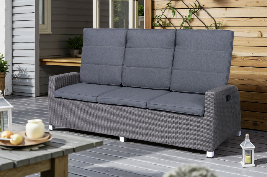 Das Untergestell besteht aus pulverbeschichtetem Aluminium, dies macht es nicht nur stabil, sondern sorgt auch dafür, dass sich das Sofa aufgrund des relativ geringen Gewichts ganz leicht hin und her stellen lässt. Das Aluminiumgestell wird mit Polyrattangeflecht bespannt. Das halbrunde Geflecht ist in der Farbe stahlgrau-meliert gehalten und integriert sich so wunderbar in alle möglichen Terrasseneinrichtungen. Gemütliche Sitz- und Rückenpolster (100 % Polyester (220 g/m³)) sorgen für höchsten Sitzkomfort. Farblich sind die schiefergraufarbenen Polster mit Quernähten perfekt auf das Geflecht abgestimmt.