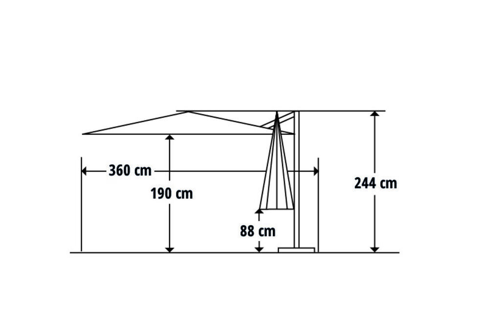 Für eine bestmögliche Planung des Aufstellortes Ihres neuen Schattenspenders haben wir Ihnen die wichtigsten Maße des Tunis Mittelstockschirms zusammengestellt: