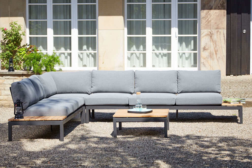 Das witterungsbeständige und pflegeleichte Loungemöbelset besteht aus einem 2-Sitzer Modul mit einer Teakablage auf der linken Seite, einem weiteren 2-Sitzer Modul mit der Teakablage auf der rechten Seite, einem Mittelmodul und einem Eckmodul. Das Set bietet bis zu 5 Personen bequem Platz zum Relaxen. Das Gestell der Lounge besteht aus pulverbeschichtetem Aluminium in matt-anthrazit und macht es stabil und widerstandsfähig.