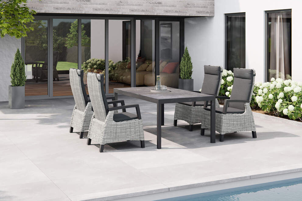 Holen Sie sich eine Extraportion Komfort in Ihren Garten. Die moderne Serie Carlos/Corido besticht durch höchsten Sitzgenuss. Die einzigartigen Wellness-Möbel vereinen gekonnt Qualität mit trendigem funktionalen Design. Die Rückenlehne des bequemen Sessels lässt sich mehrfach verstellen, somit wird jedes Essen zu einem gemütlichen Miteinander.