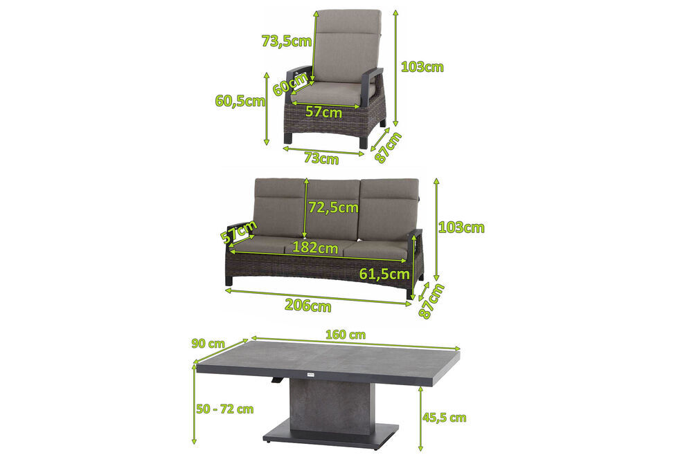 Die Rückenlehne des bequemen 3-Sitzer Loungesofas lässt sich stufenlos und individuell verstellen. Die Rückenlehne von jedem Sitzplatz lässt sich ganz einfach über einen Knopf in der jeweiligen Armlehne individuell einstellen, wobei die Verstellung für den mittleren Platz über eine Schlaufe auf der Sitzfläche geschieht. Das integrierte Hydrauliksystem sorgt für ganz sanft laufende Rückenlehnen. Das Sofa hat ein Gesamtmaß von ca. 87 x 206 x 103 cm. Die ca. 182 cm breite Sitzfläche bietet genügend Platz für 3 Personen. Mit einer großzügigen Sitztiefe von ca. 57 cm und bei einer Sitzhöhe von ca. 36 cm ohne Kissen lässt es sich hier auch herrlich bei einem Nickerchen entspannen. Die praktischen Armlehnen bieten zusätzlichen Komfort und sind echte Hingucker. Passende, extra starke Kissen in der Trendfarbe taupe meliert verleihen dem Sitzmöbel ein unvergleichliches Sitzerlebnis. Das Untergestell des Sofas besteht aus pulverbeschichtetem Aluminium in matt-anthrazit und macht das Loungesofa nicht nur stabil, sondern sorgt auch dafür, dass es sich aufgrund des relativ geringen Gewichts (ca. 32,5 kg) gut hin und her stellen lässt. Das Aluminiumgestell wird mit halbrundem GARDINO®-Geflecht aus Polyethylen bespannt. Diese Faser trocknet besonders schnell, ist schmutzunempfindlich und erzeugt mit ihrer natürlichen Optik eine edle und moderne Ausstrahlung. Der 'charcoal grey' Grauton der Faser verleiht fast jeder Gartengestaltung ein modernes Flair. Die gemütlichen und pflegeleichten Sitzpolster aus 100 % Polypropylen (280 g/m²) sind farblich passend auf das Geflecht abgestimmt. Bei Verschmutzung können Sie die Bezüge abnehmen und von Hand waschen.