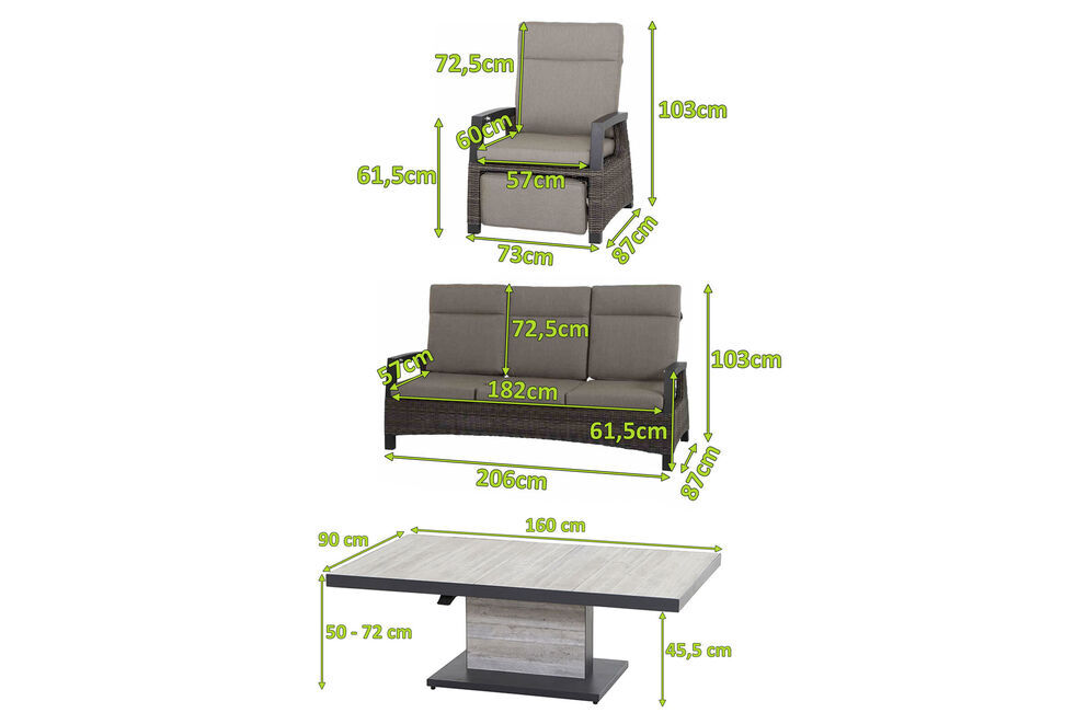 Die Rückenlehne des bequemen 3-Sitzer Loungesofas lässt sich stufenlos und individuell verstellen. Die Rückenlehne von jedem Sitzplatz lässt sich ganz einfach über einen Knopf in der jeweiligen Armlehne individuell einstellen, wobei die Verstellung für den mittleren Platz über eine Schlaufe auf der Sitzfläche geschieht. Das integrierte Hydrauliksystem sorgt für ganz sanft laufende Rückenlehnen. Das Sofa hat ein Gesamtmaß von ca. 87 x 206 x 103 cm. Die ca. 182 cm breite Sitzfläche bietet genügend Platz für 3 Personen. Mit einer großzügigen Sitztiefe von ca. 57 cm und bei einer Sitzhöhe von ca. 36 cm ohne Kissen lässt es sich hier auch herrlich bei einem Nickerchen entspannen. Die praktischen Armlehnen bieten zusätzlichen Komfort und sind echte Hingucker. Passende, extra starke Kissen in der Trendfarbe taupe meliert verleihen dem Sitzmöbel ein unvergleichliches Sitzerlebnis. Das Untergestell des Sofas besteht aus pulverbeschichtetem Aluminium in matt-anthrazit und macht das Loungesofa nicht nur stabil, sondern sorgt auch dafür, dass es sich aufgrund des relativ geringen Gewichts (ca. 32,5 kg) gut hin und her stellen lässt. Das Aluminiumgestell wird mit halbrundem GARDINO®-Geflecht aus Polyethylen bespannt. Diese Faser trocknet besonders schnell, ist schmutzunempfindlich und erzeugt mit ihrer natürlichen Optik eine edle und moderne Ausstrahlung. Der 'charcoal grey' Grauton der Faser verleiht fast jeder Gartengestaltung ein modernes Flair. Die gemütlichen und pflegeleichten Sitzpolster aus 100 % Polypropylen (280 g/m²) sind farblich passend auf das Geflecht abgestimmt. Bei Verschmutzung können Sie die Bezüge abnehmen und von Hand waschen.