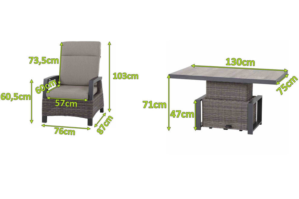 Holen Sie sich eine Extraportion Komfort in Ihren Garten. Das wetterfeste und pflegeleichte Lounge-Set besteht aus einem Lifttisch mit rechteckiger Tischplatte und 4 Loungesesseln. Egal ob Sie die Sonne genießen, ein gutes Buch lesen oder gemütlich mit Ihren Lieben Abendessen möchten. Die hochwertigen Sessel sind wahre Anpassungskünstler und ermöglichen müheloses Entspannen. Die Rückenlehnen lassen sich ganz einfach über einen Knopf in der Armlehne stufenlos einstellen. Die Sessel haben ein Gesamtmaß von jeweils ca. 73 x 87 x 103 cm. Mit der großzügigen Sitzfläche lässt es sich auch herrlich bei einem Nickerchen entschleunigen. Zusätzlichen Komfort bieten die praktischen Armlehnen aus Aluminium und die Polster in der Trendfarbe taupe meliert.