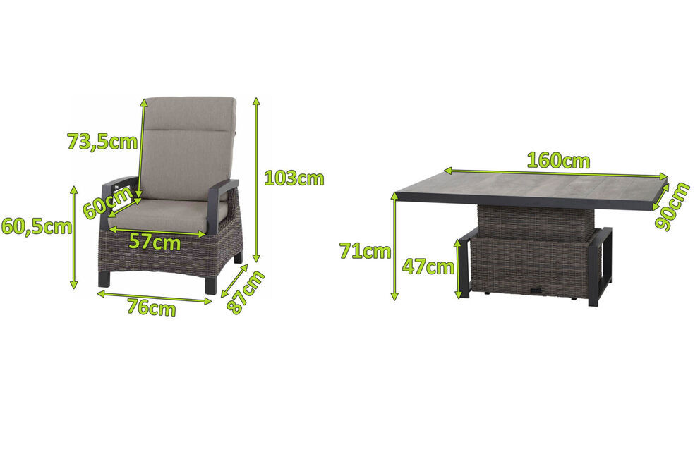 Holen Sie sich eine Extraportion Komfort in Ihren Garten. Das wetterfeste und pflegeleichte Lounge-Set besteht aus einem Lifttisch mit rechteckiger Tischplatte und 6 Loungesesseln. Egal ob Sie die Sonne genießen, ein gutes Buch lesen oder gemütlich mit Ihren Lieben Abendessen möchten. Die hochwertigen Sessel sind wahre Anpassungskünstler und ermöglichen müheloses Entspannen. Die Rückenlehnen lassen sich ganz einfach über einen Knopf in der Armlehne stufenlos einstellen. Die Sessel haben ein Gesamtmaß von jeweils ca. 73 x 87 x 103 cm. Mit der großzügigen Sitzfläche lässt es sich auch herrlich bei einem Nickerchen entschleunigen. Zusätzlichen Komfort bieten die praktischen Armlehnen aus Aluminium und die Polster in der Trendfarbe taupe meliert.