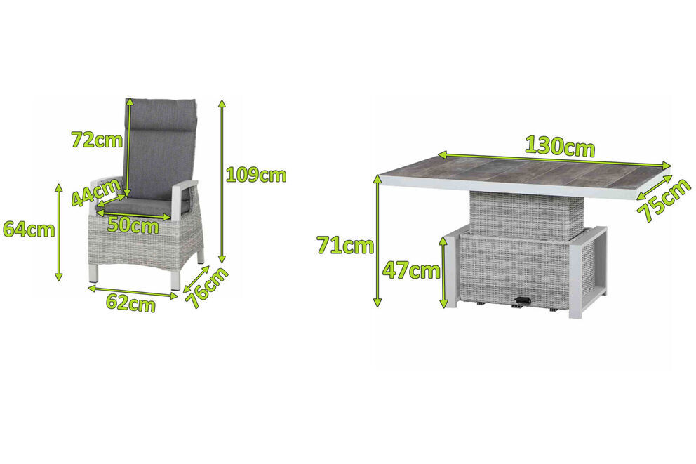 Gönnen Sie sich ein wenig Luxus in Ihrem Alltag. Das wetterfeste und pflegeleichte Dining-Set besteht aus einem Lifttisch mit rechteckiger Tischplatte und 4 bequemen Dining Sesseln. Stellen Sie die Rückenlehne des Anpassungskünstlers ganz einfach über einen Knopf in der Armlehne stufenlos ein. Jeder Sessel hat ein Gesamtmaß von ca. 76 x 62 x 109 cm. Die großzügig bemessene Sitzfläche bietet ein tolles Sitzgefühl, hier lässt es sich auch herrlich bei einem Nickerchen entschleunigen. Die praktischen Armlehnen aus Aluminium bieten zusätzlichen Komfort. Passende Sitzpolster in der Trendfarbe stone grey verleihen den Sitzmöbeln ein unvergleichliches Sitzerlebnis. Freuen Sie sich auf gemeinsame Grillabende und gemütliches Beisammensein mit Ihren Lieben.