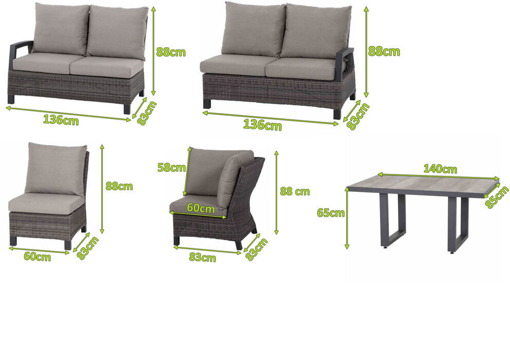 Die schicken 2-Sitzer mit einem Gesamtmaß von jeweils ca. 83 x 136 x 88 cm sind die idealen Begleiter und laden Sie jederzeit zum Verweilen ein. Die ca. 128 cm breite Sitzfläche bietet genügend Platz für je 2 Personen. Mit einer großzügigen Sitztiefe von ca. 63,5 cm und bei einer Sitzhöhe von ca. 36 cm ohne Kissen lässt es sich herrlich entspannen, allein oder mit Ihren Liebsten. Die praktischen Armlehnen bieten zusätzlichen Komfort und sind zudem ein echter Hingucker. Das Mittemodul ist ca. 60 x 83 x 88 cm groß und das Eckmodul hat Maße von ca. 83 x 83 x 88 cm und sie sind perfekt zum Füße hochlegen oder zum Vergrößern der Sitz- oder Liegefläche. Passende, extra starke Kissen in der Trendfarbe 'taupe meliert' verleihen den Sitzmöbeln ein unvergleichliches Sitzerlebnis. Der Loungetisch hat eine Größe von ca. 140 x 85 cm und eine Unterschubhöhe von ca. 61,5 cm. Der Tisch wird mit einer modernen Keramik-Tischplatte in der Farbe 'washed grey' geliefert. Sie verleiht ihm einen edlen Charakter und natürlichen Look. Die Tischplatte ist robust, pflegeleicht und dazu noch wetterfest - so steht einem leckeren Brunch mit Freunden und Familie nichts im Wege.