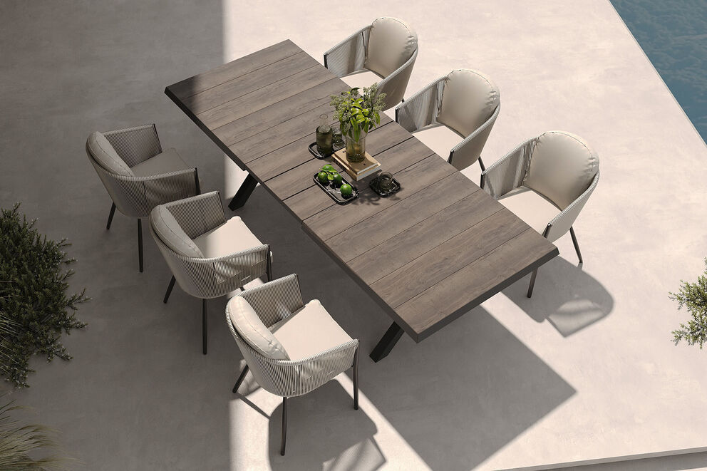 Die Kombination aus anthrazitfarbenem Aluminium, natürlicher Keramikoptik und beigem Rope-Geflecht verleiht der Essgruppe eine moderne, harmonische Ausstrahlung. Sie fügt sich mühelos in unterschiedlichste Gartenstile ein und wertet Ihren Außenbereich optisch deutlich auf. |