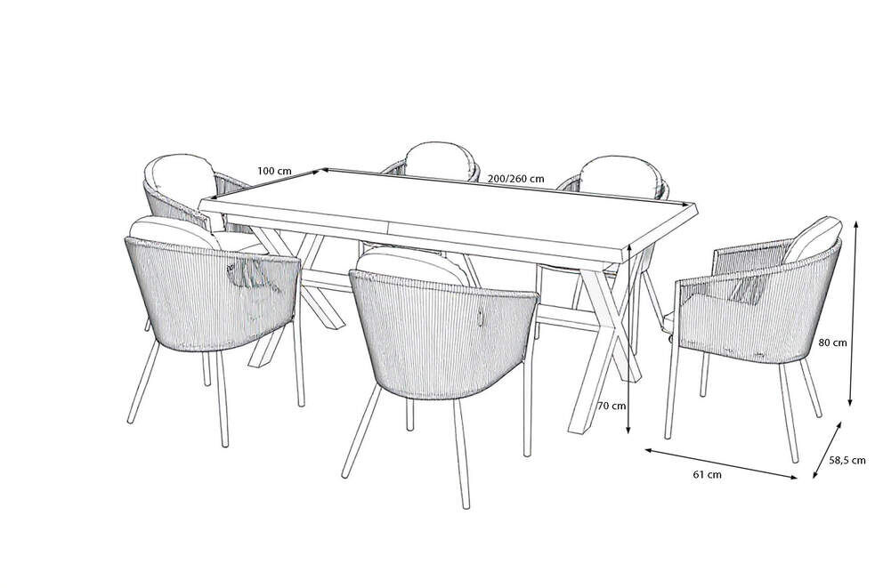 Genießen Sie unvergessliche Momente im Freien mit dieser hochwertigen Garten-Essgruppe von SIENA GARDEN, bestehend aus dem eleganten Ausziehtisch Sincro und sechs komfortablen Dining-Sesseln Tavio. Dieses Ensemble vereint modernes Design, langlebige Materialien und durchdachte Funktionen zu einer harmonischen Einheit, die Ihren Außenbereich zu einem Ort besonderer Atmosphäre macht. Ob für gesellige Familienessen, entspannte Abende mit Freunden oder stilvolle Gartenpartys – diese Essgruppe schafft den perfekten Rahmen.