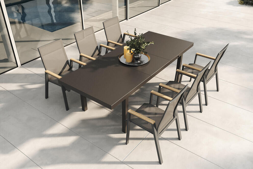 Ergänzt wird der Tisch durch sechs SIENA GARDEN Savona Stapelsessel, die Komfort und Design in idealer Weise vereinen. Das stabile Aluminiumgestell in matt-anthrazit ist mit einer hochwertigen Ranotex® Textilbespannung in Schwarz-Silber kombiniert – luftdurchlässig, schnelltrocknend und äußerst pflegeleicht. Die angenehm geneigte Rückenlehne und die Armlehnen mit edlen Teakholz-Inlays sorgen für ein komfortables Sitzgefühl. Und wenn der Platz einmal knapp wird, lassen sich die Sessel einfach stapeln und platzsparend verstauen.