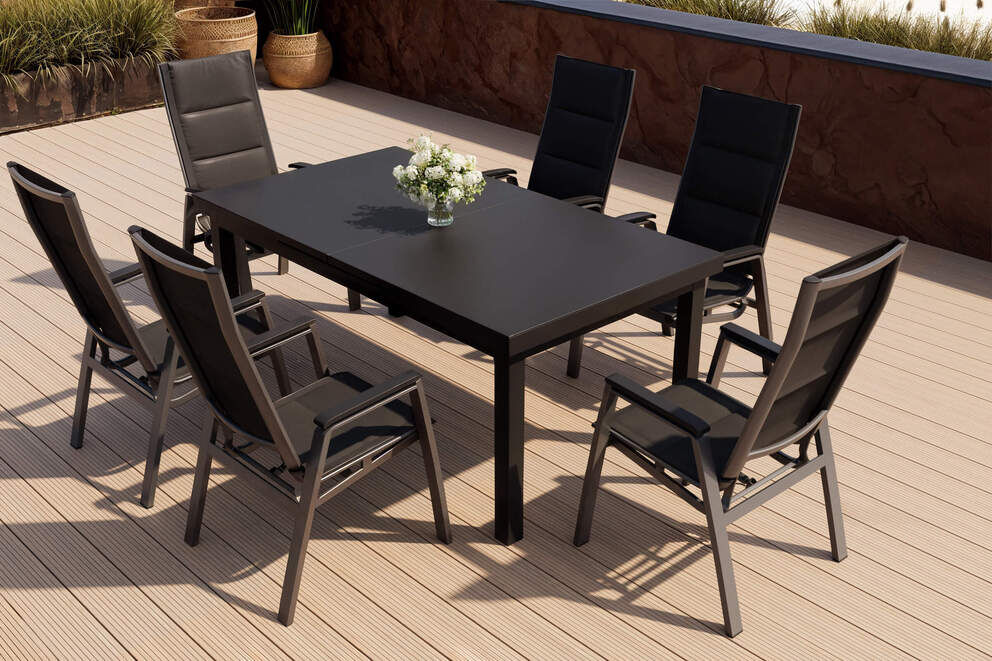 Diese Garten-Essgruppe ist ideal für alle, die modernes Design, hochwertige Materialien und hohe Funktionalität schätzen. Mit dieser Kombination aus Stil und Komfort schaffen Sie den perfekten Ort für entspannte Stunden im Freien – ob beim Frühstück im Sonnenschein oder beim Grillabend mit Freunden.