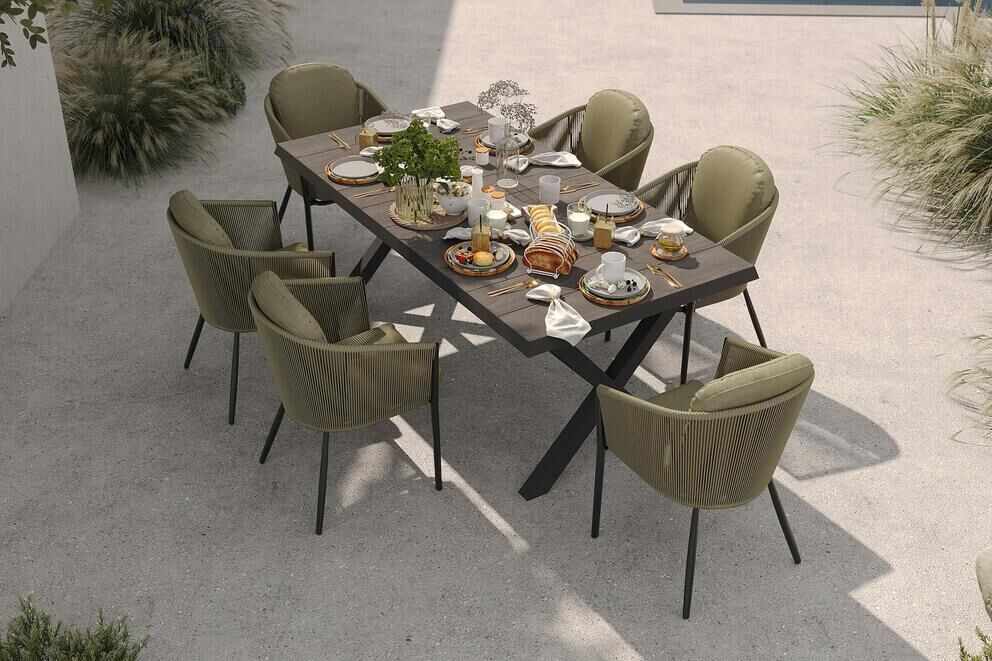 Die sechs Dining Sessel der Serie OUTFLEXX Tavio ergänzen den Tisch perfekt. Das anthrazitfarbene Aluminiumgestell harmoniert stilvoll mit dem seitlichen Rope-Geflecht, das nicht nur ein modernes Erscheinungsbild erzeugt, sondern durch seine leichte Flexibilität ein besonders angenehmes Sitzgefühl vermittelt. Die Sessel sind mit bequemen Sitz- und Rückenkissen ausgestattet, die in einem dezenten Grünton gehalten sind und ausreichend Polsterung für lange Sommerabende bieten. Die Bezüge lassen sich dank Reißverschluss einfach abnehmen und reinigen – ein klarer Vorteil für den regelmäßigen Gebrauch im Outdoor-Bereich.