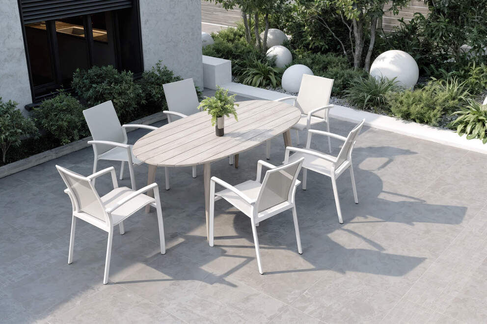Ergänzt wird das Ensemble durch sechs Dining-Sessel aus der Serie Velia von SIENA GARDEN. Diese Sessel vereinen modernes Design mit höchstem Sitzkomfort. Das pulverbeschichtete Aluminiumgestell in mattem Weiß-Grau wirkt nicht nur leicht und modern, sondern ist auch korrosionsbeständig und äußerst pflegeleicht. Die Bespannung aus luftdurchlässigem Ranotex®-Gewebe (1x1 Struktur) bietet ein angenehmes Sitzgefühl, auch an heißen Tagen. Dank ihres geringen Gewichts von ca. 3,3 kg lassen sich die Sessel mühelos transportieren und platzsparend stapeln – ideal für eine flexible Nutzung und Aufbewahrung.