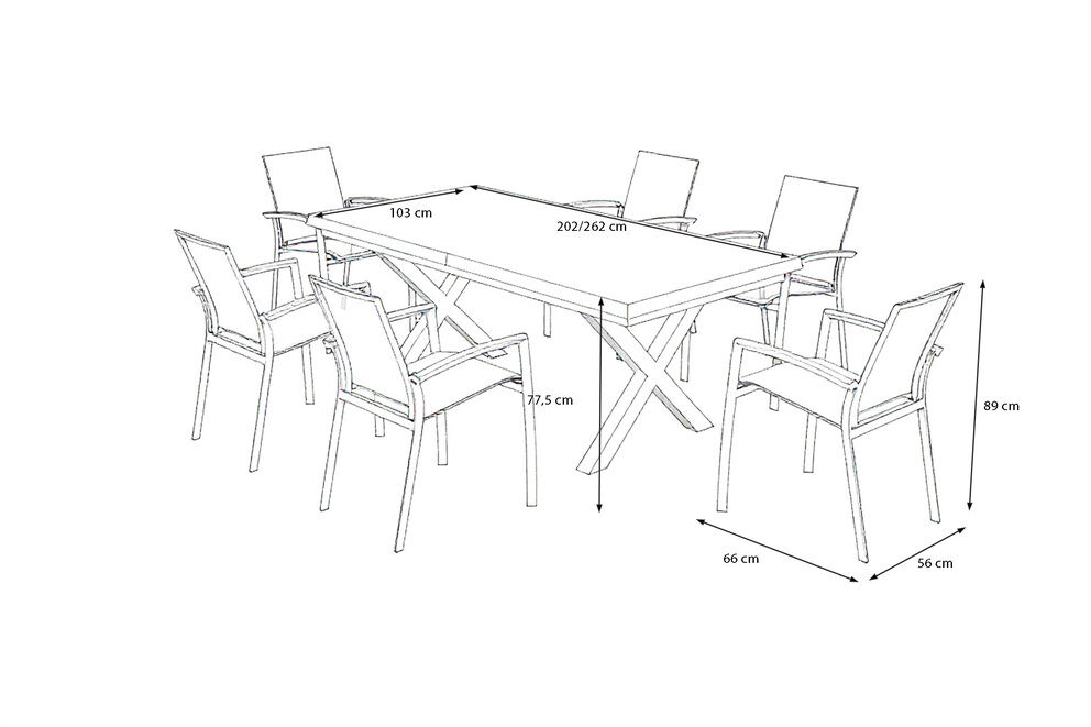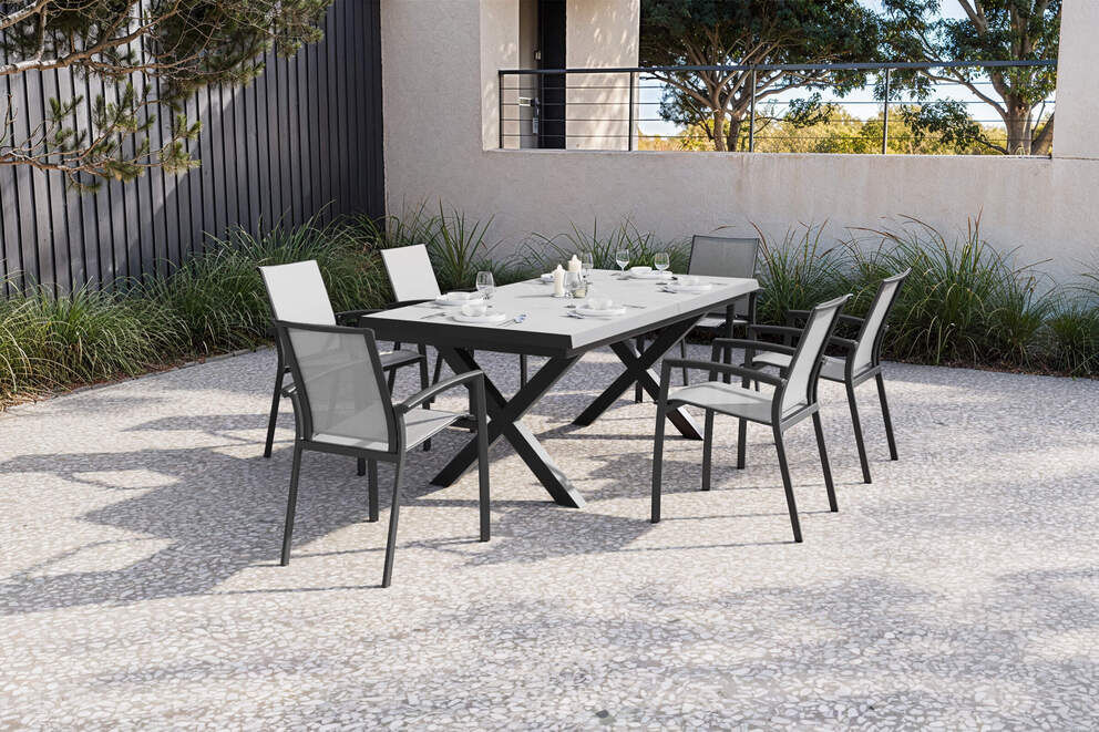 Der großzügige OUTFLEXX Serro Ausziehtisch überzeugt durch ein modernes X-Gestell aus pulverbeschichtetem Aluminium in Schwarz. Durch die stabile Konstruktion erhält der Tisch besondere Standfestigkeit, während die Oberfläche dank Pulverbeschichtung vor Witterungseinflüssen geschützt bleibt. Die Tischplatte aus grauer Steinimitat ist nicht nur ein optisches Highlight, sondern punktet auch mit hoher Robustkeit und Pflegeleichtigkeit. Mit einer Länge von ca. 202 cm bietet der Tisch bereits im unaufgeklappten Zustand viel Platz für gesellige Runden. Bei Bedarf lässt er sich komfortabel auf ca. 262 cm ausziehen und bietet damit ausreichend Raum für zusätzliche Gäste.