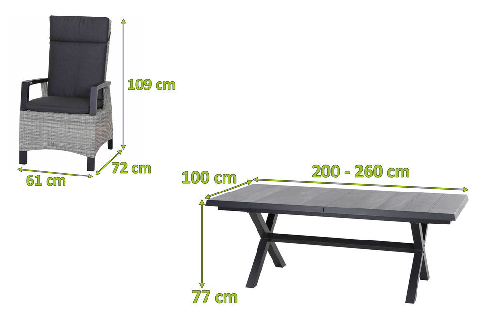 Wer das Besondere liebt ist mit diesem Esstisch bestens bedient. Der Tisch bietet mit seinen Maßen von ca. 200/260 x 100 x 77 cm Platz für ca. 8-10 Personen - so steht dem gemütlichen Mittagessen mit der Familie nichts mehr im Wege. Das Gestell wurde aus pulverbeschichtetem Aluminium hergestellt, was den Tisch besonders haltbar macht. Die Tischplatte besteht aus hochwertigem Keramik, während die Tischbeine für ein weiteres optisches Highlight sorgen. Durch die großzügige Unterschubhöhe kann man gemütlich mit vielen Arten von Sesseln an diesem Tisch Platz nehmen. Der Tisch ist durch das Eigengewicht von ca. 88 kg perfekt gegen Windstöße geschützt. Die Fußkappen bestehen aus Kunststoff und schützen den Boden vor unschönen Kratzern beim Verrücken des Möbelstücks.