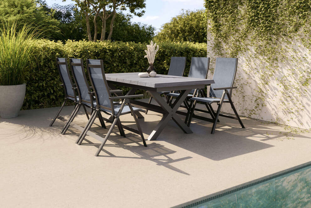 Das Set besticht durch seine Kombination aus pulverbeschichtetem Aluminium, wetterfestem Textilene und einer eleganten Tischplatte aus Keramikleisten. Die Farbgebung in anthrazit/grau sorgt für einen modernen Look, der sich harmonisch in jede Outdoor-Umgebung einfügt.