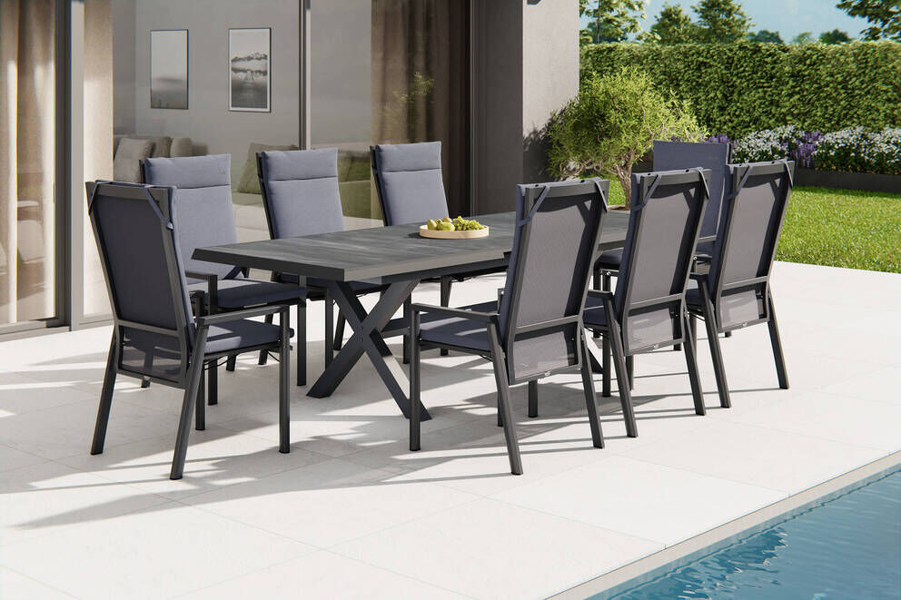 Wer das Besondere liebt ist mit diesem Esstisch bestens bedient. Der Tisch bietet mit seinen Maßen von ca. 200/260 x 100 x 77 cm Platz für ca. 8-10 Personen - so steht dem gemütlichen Mittagessen mit der Familie nichts mehr im Wege. Das Gestell wurde aus pulverbeschichtetem Aluminium hergestellt, was den Tisch besonders haltbar macht. Die Tischplatte besteht aus hochwertigem Keramik, während die Tischbeine für ein weiteres optisches Highlight sorgen. Durch die großzügige Unterschubhöhe kann man gemütlich mit vielen Arten von Sesseln an diesem Tisch Platz nehmen. Der Tisch ist durch das Eigengewicht von ca. 88 kg perfekt gegen Windstöße geschützt. Die Fußkappen bestehen aus Kunststoff und schützen den Boden vor unschönen Kratzern beim Verrücken des Möbelstücks.