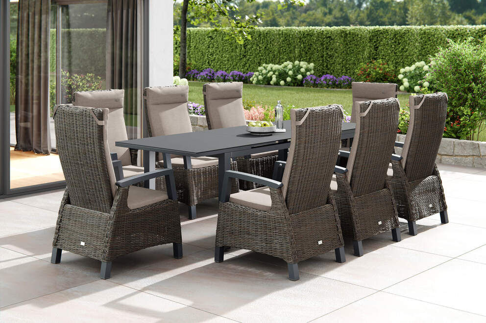 Die acht Corido Dining Sessel ergänzen den Tisch perfekt und bieten dank ihrer ergonomischen Form und der n Polster maximalen Sitzkomfort. Mit der verstellbaren Rückenlehne lässt sich für jeden Gast die perfekte Sitzposition finden. Die Verwendung von Gardino®-Geflecht sorgt für eine angenehme Haptik und unterstreicht die Langlebigkeit und Wetterbeständigkeit der Möbel.