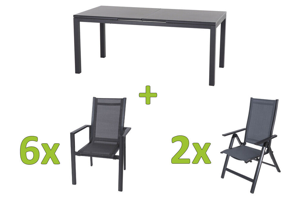 Die SIENA GARDEN Miros Gartenessgruppe vereint Funktionalität mit einem modernen Design und bietet das perfekte Ambiente für gemütliche Stunden im Freien. Hergestellt aus hochwertigem, anthrazitfarbenem Aluminium, präsentiert sich dieses Set als ein zeitloses Highlight in Ihrem Garten. Die Kombination aus einem ca. 180/240x90 cm großen SIENA GARDEN Ausziehtisch, sechs OUTFLEXX Stapelsesseln sowie zwei OUTFLEXX Klappstühlen bietet reichlich Platz für Familie und Freunde.
