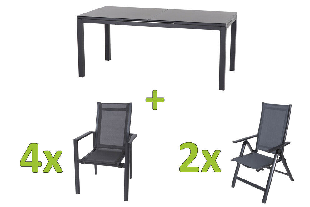 Erleben Sie mit der SIENA GARDEN Miros Gartenessgruppe ein harmonisches Design, das stilvolle Eleganz mit praktischer Funktionalität verbindet. Die perfekte Symbiose aus dem anthrazitfarbenen, ausziehbaren Aluminiumtisch von SIENA GARDEN und den bequemen OUTFLEXX Stapel- und Klappstühlen macht jedes Beisammensein im Freien zu einem besonderen Ereignis.