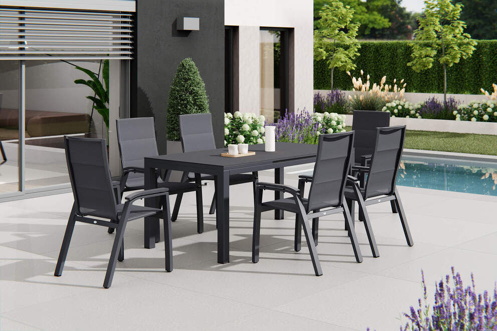 Die Farbgebung in mattem Anthrazit verleiht der Garnitur eine moderne Eleganz, während die pulverbeschichteten Aluminiumrahmen und die mit Keramikpulver beschichtete Glasplatte nicht nur für ein ansprechendes Design, sondern auch für eine hohe Widerstandsfähigkeit gegenüber Witterungseinflüssen sorgen. Die sechs mitgelieferten Sessel bieten mit ihren Maßen von ca. 59 x 69 x 105 cm optimalen Sitzkomfort und sind dank der Stapelfunktion leicht zu verstauen.